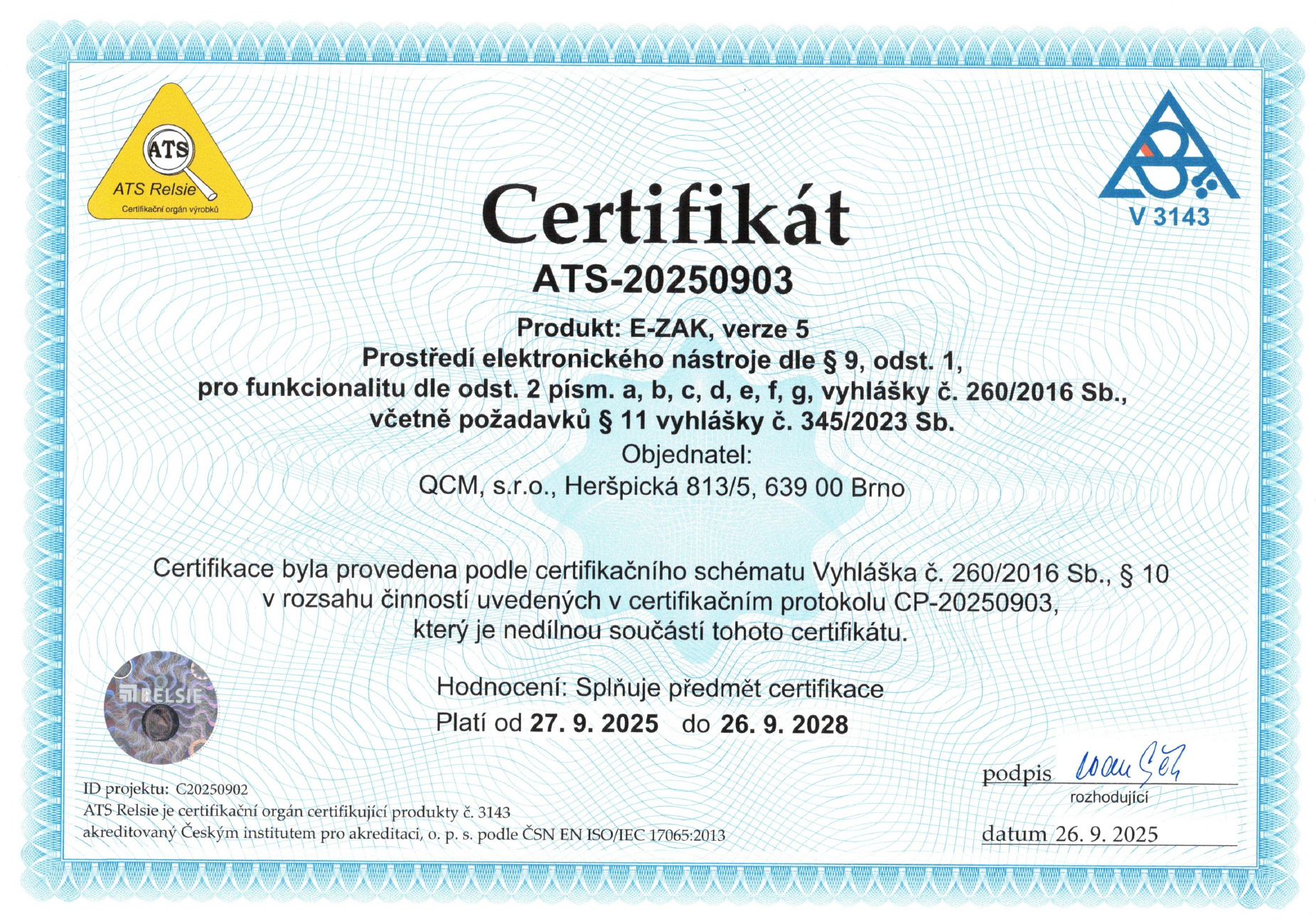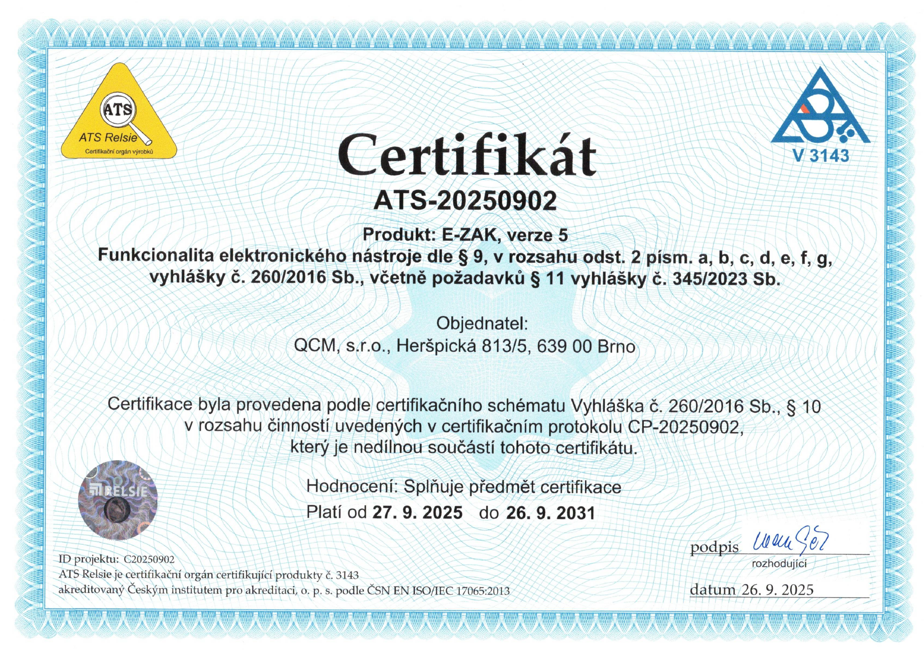 E-ZAK jako elektronický nástroj je certifikován dle vyhlášky č. 260/2016 Sb.