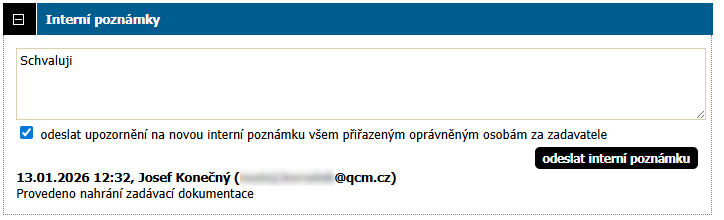 Vloženou poznámku nelze editovat ani smazat. Současně při jejím vytvoření lze odeslat upozornění na novou interní poznámku všem přiřazeným oprávněným osobám za zadavatele.