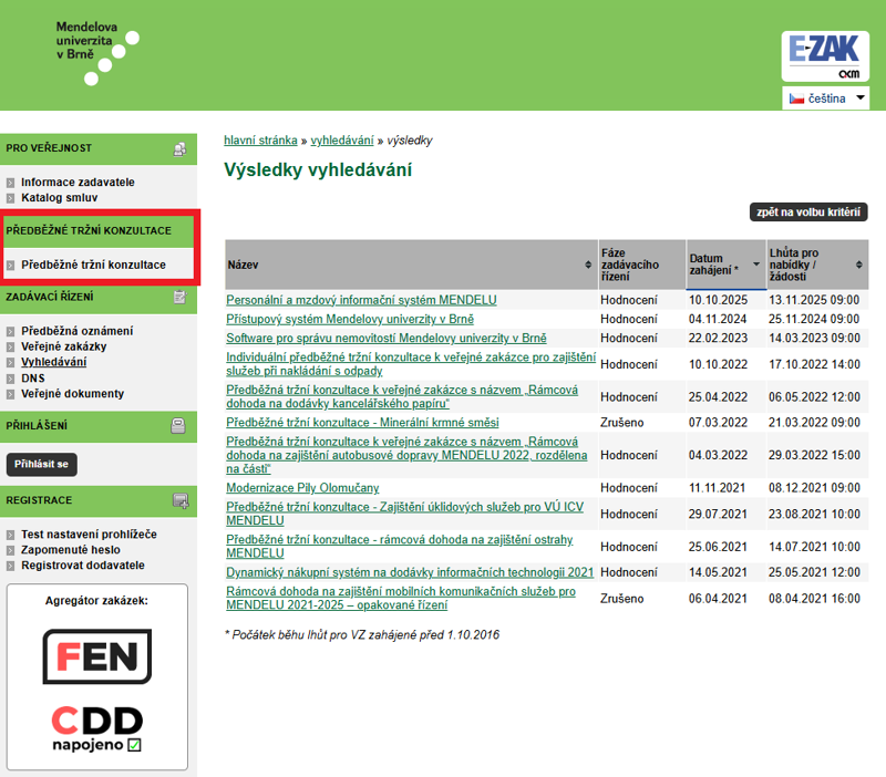 Nástroj E-ZAK také umožňuje úpravu levého navigačního menu pro přehledné zobrazení všech vypsaných předběžných tržních konzultací zadavatele.
