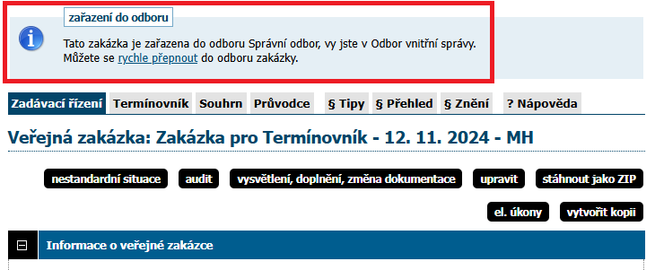 Uživatel, který má přiděleno oprávnění Může si změnit oddělení, může využívat funkci Rychlá změna oddělení, která umožní rychle přepnout mezi odděleními přímo na detailu zakázky.