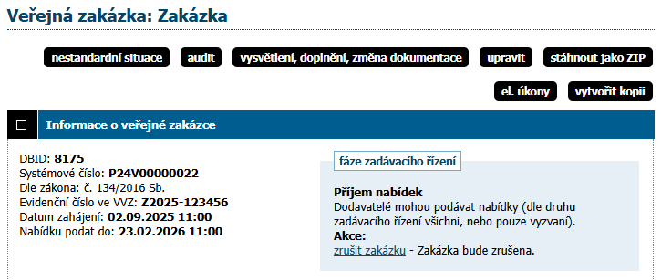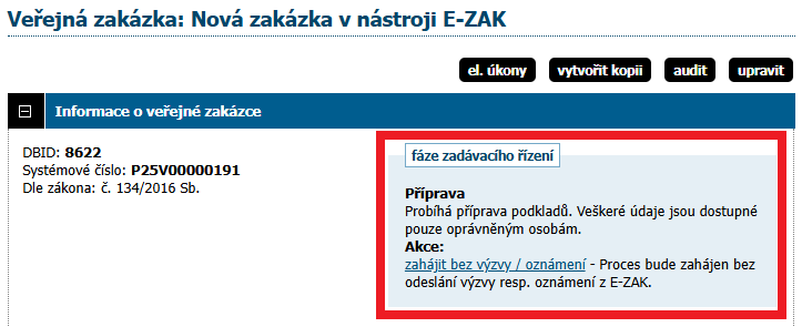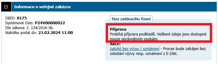 Jedná se o přípravné stádium veřejné zakázky, veškeré údaje jsou dostupné pouze pověřeným osobám zadavatele a lze je všechny libovolně editovat.