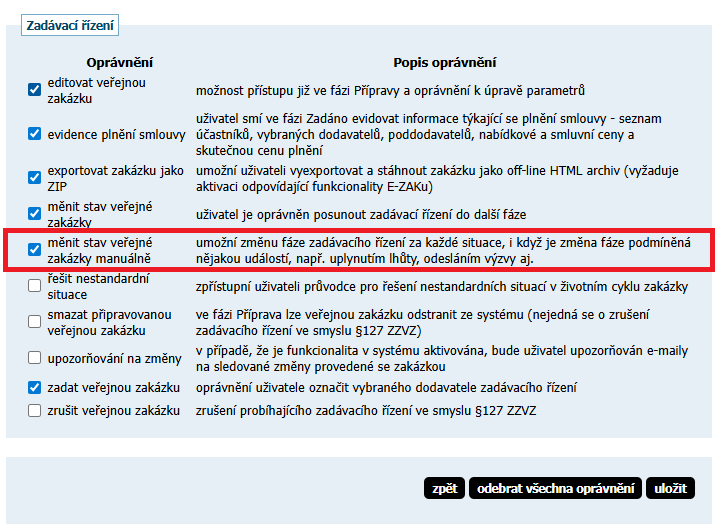 Toto chování lze změnit nastavením oprávnění měnit stav veřejné zakázky manuálně v bloku Oprávnění osoby za zadavatele – poté bude akce pro přechod do následující fáze nabídnuta v rámečku fáze zadávacího řízení.