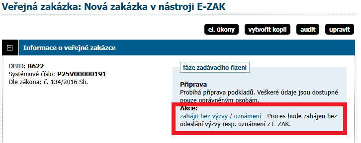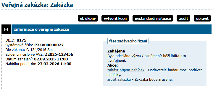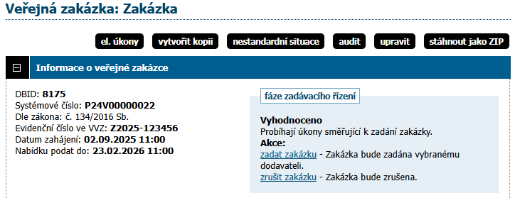 Pokud zadavatel vyplnil Evidenční číslo ve VVZ, pak dojde k automatickému posunu zakázky po jejím uveřejnění.