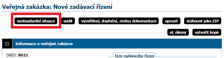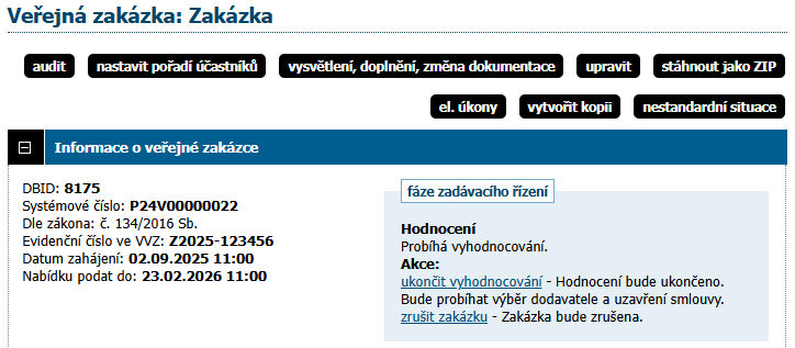 O aktuální fázi zadávacího řízení a možných akcích informuje v detailu zakázky barevný rámeček fáze zadávacího řízení.