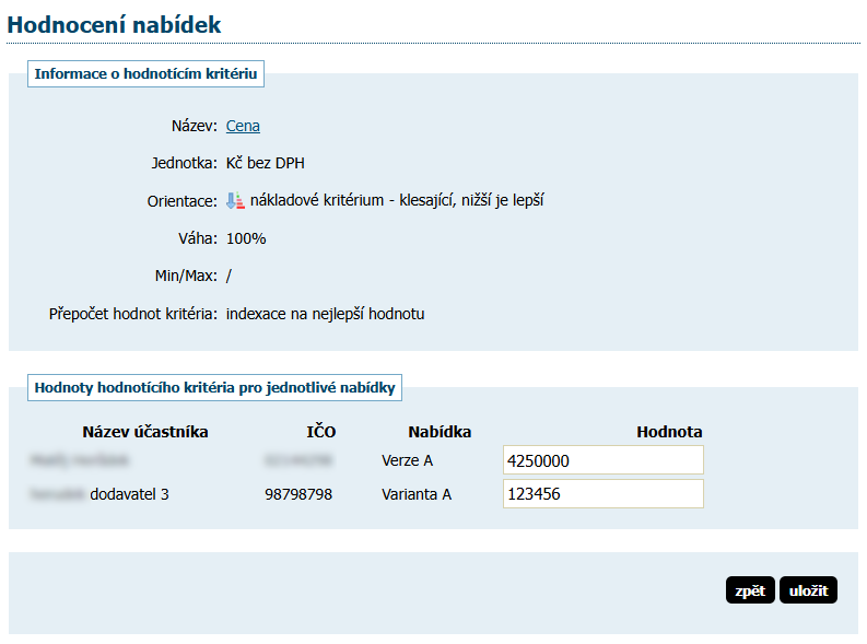 Po zařazení nabídek do hodnocení se hodnoty z přijatých nabídek přenesou do bloku Hodnocení nabídek.