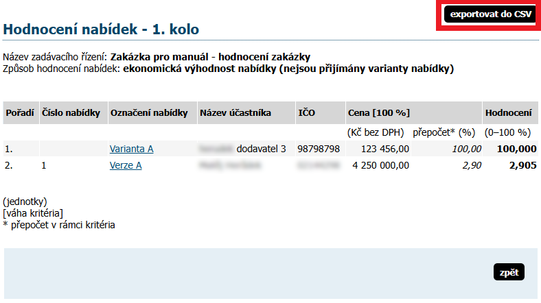 Nástroj E-ZAK automaticky spočítá pořadí dodavatelů na základě uvedených hodnot.