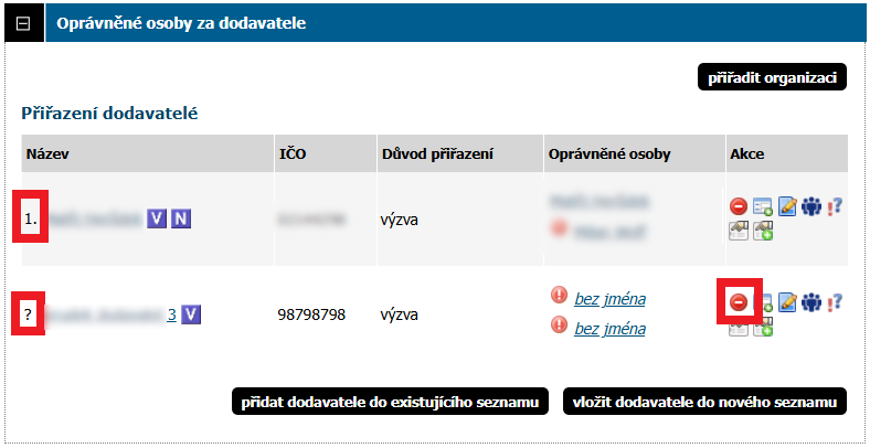 Dodavatele, kteří nebyli hodnoceni (nepodali nabídku), je třeba vyloučit ze zadávacího řízení v bloku Oprávněné osoby za dodavatele - je k tomu vyžadováno oprávnění zadavatele vyloučit přiřazenou organizaci ze zadávacího řízení.
