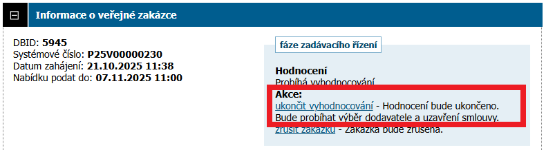 Jakmile je nastaveno platné pořadí všech dodavatelů a ukončeno hodnotící kolo, lze ukončit vyhodnocování zakázky.