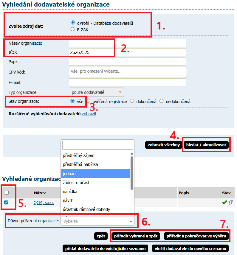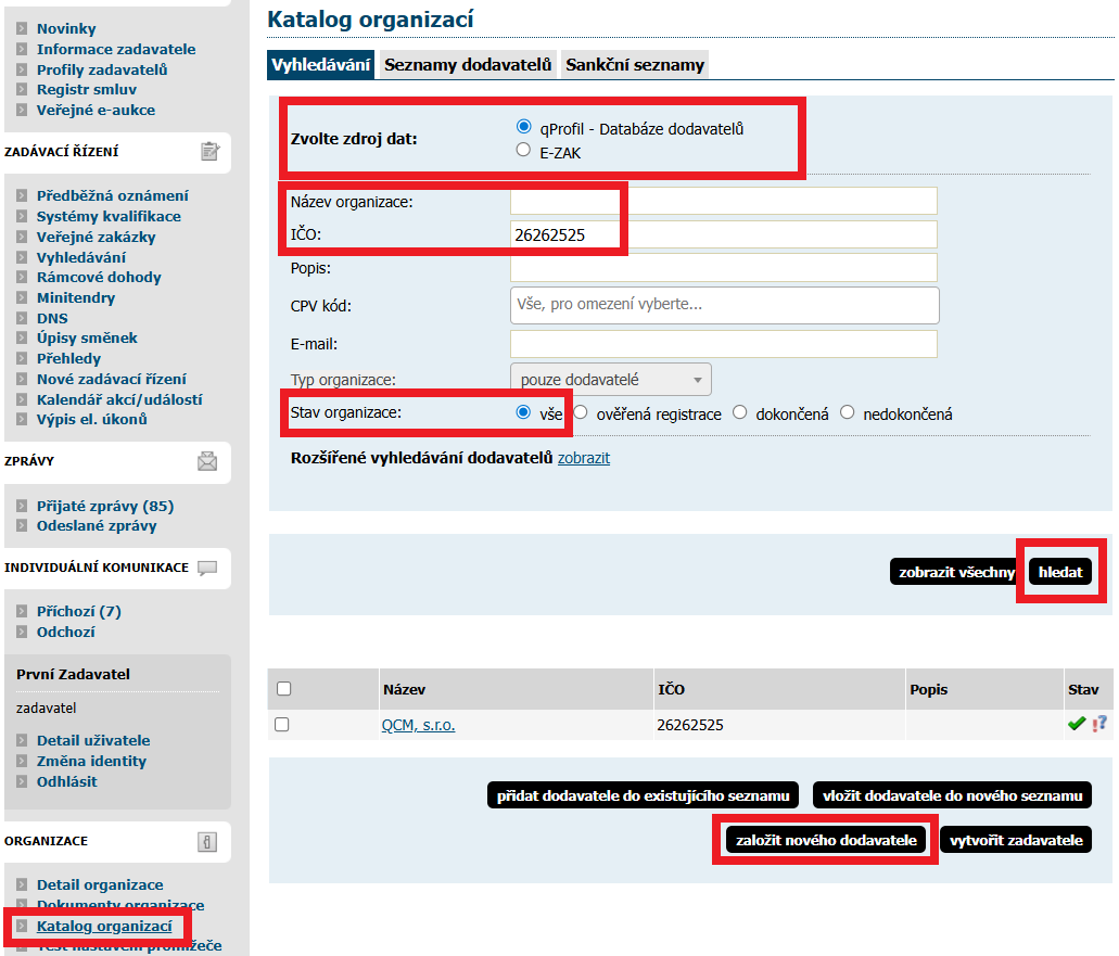 v E-ZAKu, nebo v qProfil - Databáze dodavatelů.Důležité je vždy vyhledávat subjekty nejen mezi ověřenými organizacemi, ale mezi všemi organizacemi.