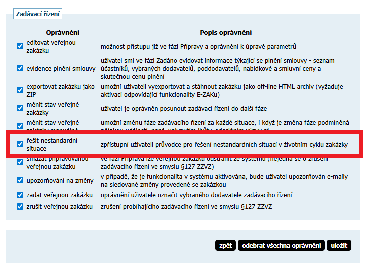 Nejprve si nastavte oprávnění řešit nestandardní situace v bloku Oprávněné osoby za zadavatele.