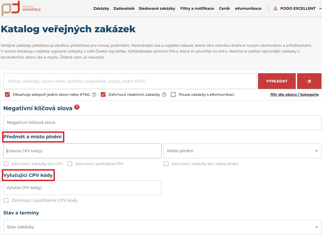 Povinné vyplnění Položek předmětu pomáhá dodavatelům snadněji vyhledávat zakázky podle konkrétního CPV kódu na Portále Dodavatele https://podo.fen.cz, kde má uživatel po přihlášení tuto volbu k dispozici v rozšířeném vyhledávání.
