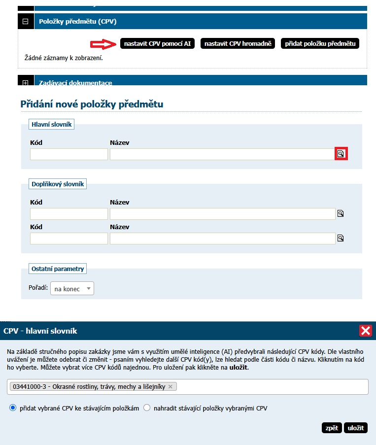 Novou volbou je také nastavit CPV pomocí AI (umělé inteligence), kdy se předvyberou a nabídnou kódy podle textu ve stručném popisu předmětu zakázky.