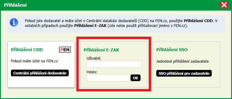 Zadavatel využije login a heslo uprostřed, případně SSO přihlášení napravo v případě, že toto aktivně využívá.