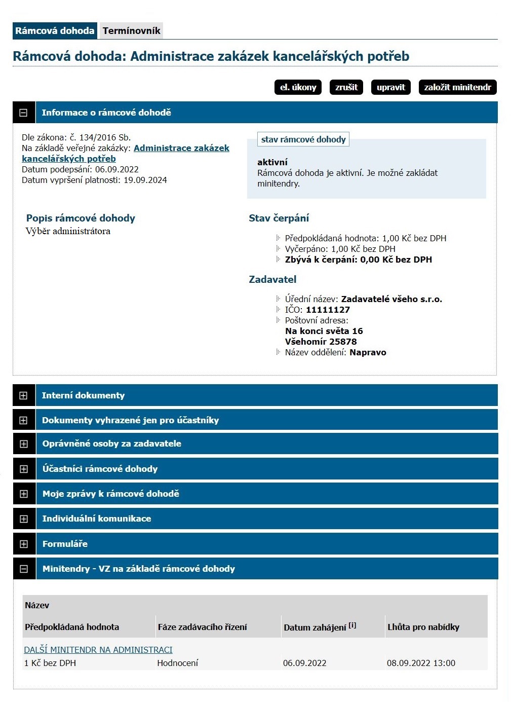 Rámcová dohoda na svém detailu obsahuje mimo odkazu na zadávací řízení, z něhož vznikla, také blok Minitendry se seznamem souvisejících zadávacích řízení.