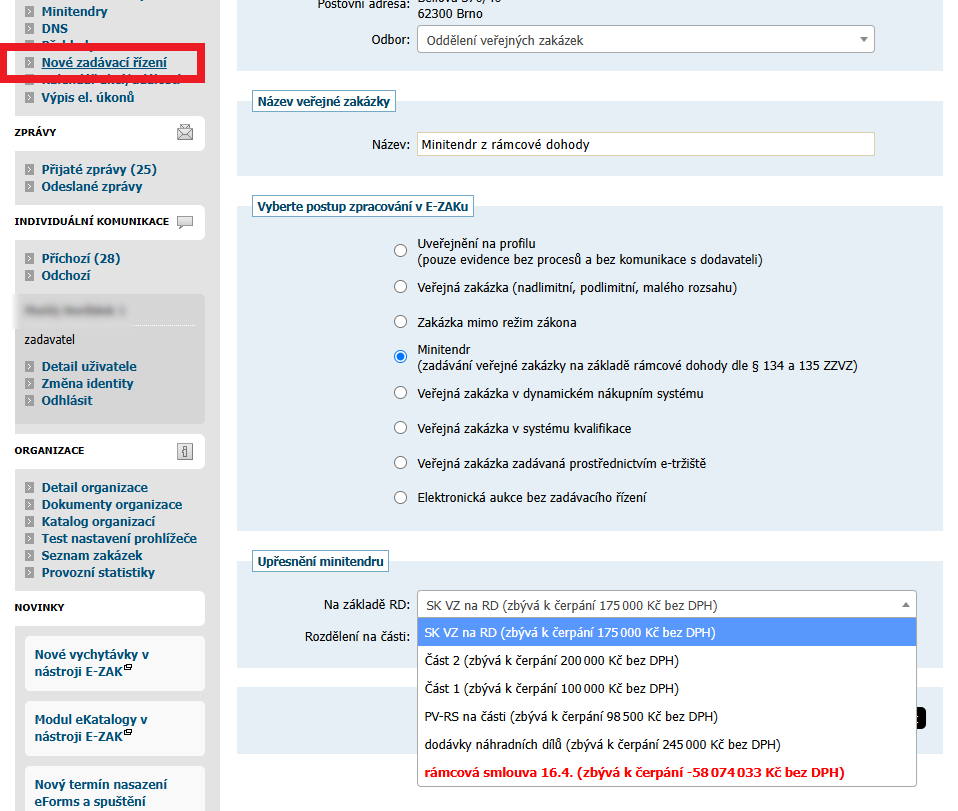 U rámcové dohody je umožněna také individuální komunikace mezi zadavatelem a účastníky (vyžaduje oprávnění odesílat a číst jiné zprávy) obdobně jako u zakázky.