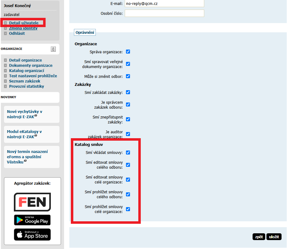 Pracovat s registrem smluv může pouze uživatel, který má nastavena oprávnění v rámci bloku Registr smluv na detailu uživatele.