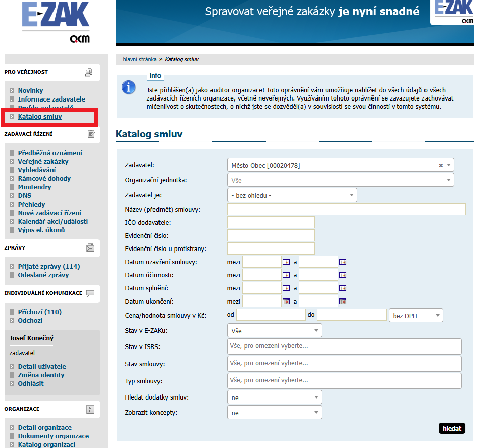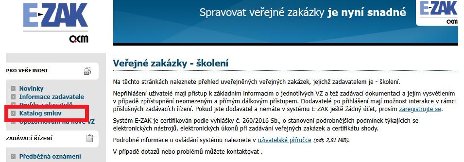 Modul Registr smluv, někdy též nazývaný jako Katalog smluv, se na E-ZAKu zobrazuje vlevo nahoře v sekci Pro veřejnost a dá se nazvat libovolně dle přání zákazníka.