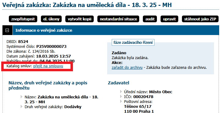 V detailu zakázky do prvního bloku Informace o veřejné zakázce vznikne v levém horním rohu nová položka Registr smluv/katalog smluv, která obsahuje odkaz na záznam (smlouvu) v Registru smluv.