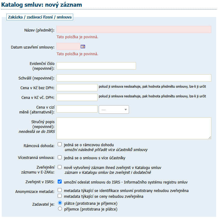 V sekci Zakázka/zadávací řízení/smlouva je třeba při vložení smlouvy uvést zejména povinné údaje.