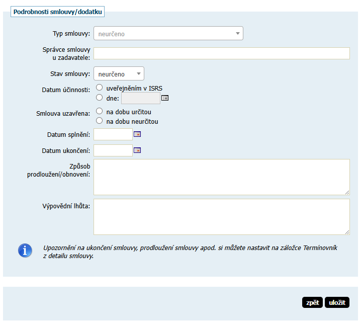 V sekci Podrobnosti smlouvy/dodatku můžete uvést další informace o smlouvě či dodatku.