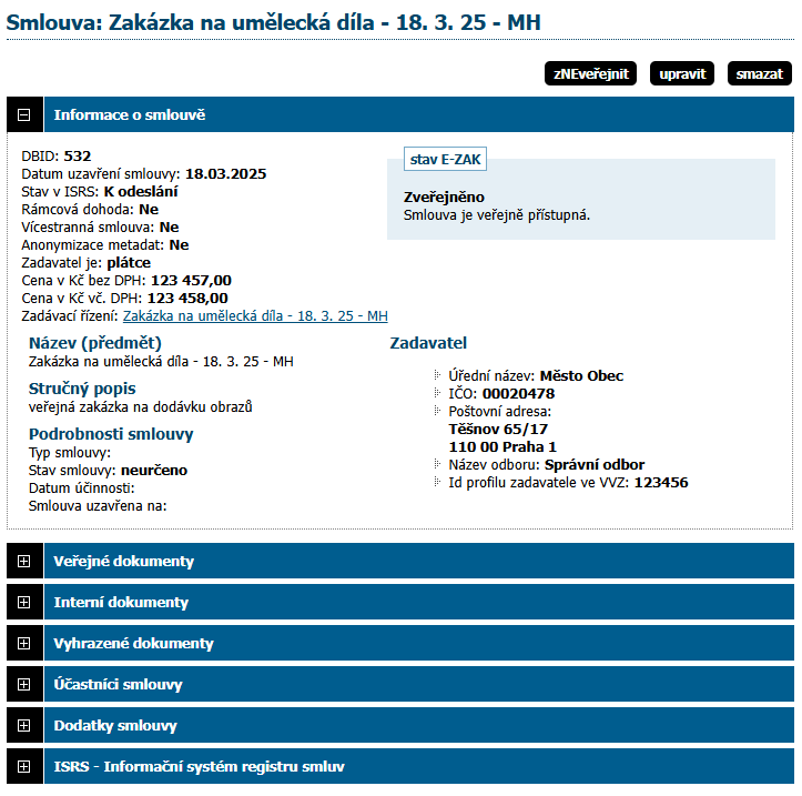 Při odeslání veřejného dokumentu ze zakázky do Registru/Katalogu smluv se vytvoří