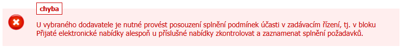 Pokud systém zahlásí chybu: "U vybraného dodavatele je nutné provést posouzení splnění podmínek účasti v zadávacím řízení, tj. v bloku Přijaté elektronické nabídky alespoň u příslušné nabídky zkontrolovat a zaznamenat splnění požadavků.", je nutné toto provést kliknutím na ikonu zelené fajfky v bloku Přijaté elektronické nabídky.