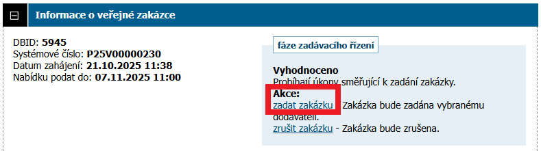 Přechod z fáze Vyhodnoceno do Zadáno provedete pomocí volby zadat zakázku v barevném boxu fáze zadávacího řízení na detailu zakázky.