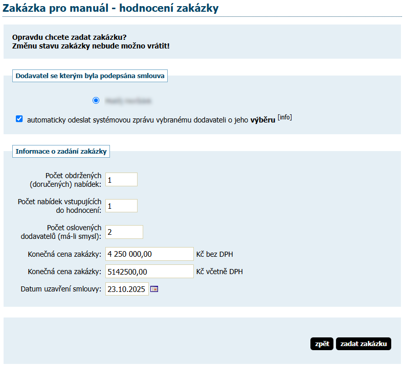Současně je možné zatržítkem automaticky odeslat systémovou zprávu vybranému dodavateli o jeho výběru a ostatním o jejich nevýběru.