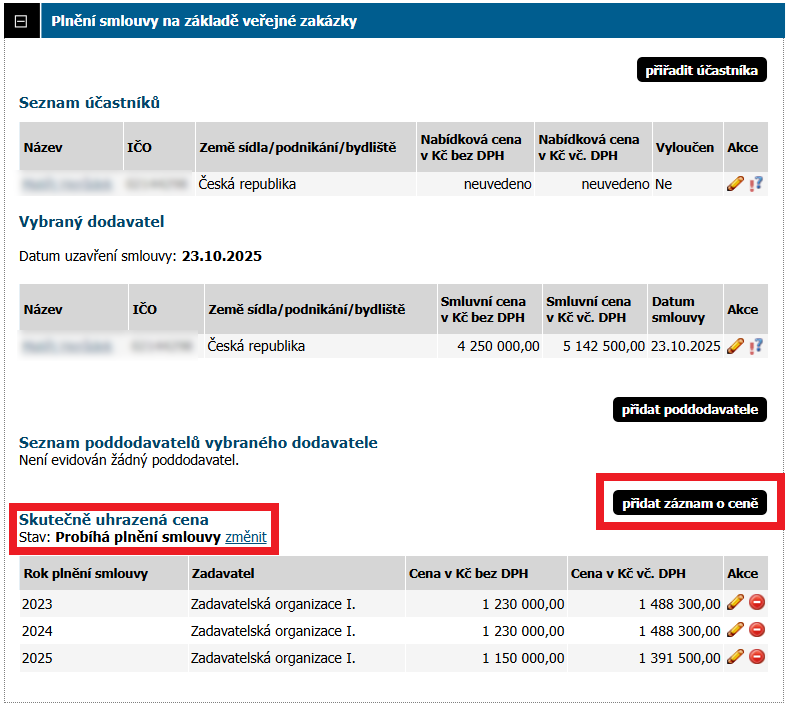 Současně dole na detailu zakázky přibude blok Plnění smlouvy na základě veřejné zakázky, v němž je možné: