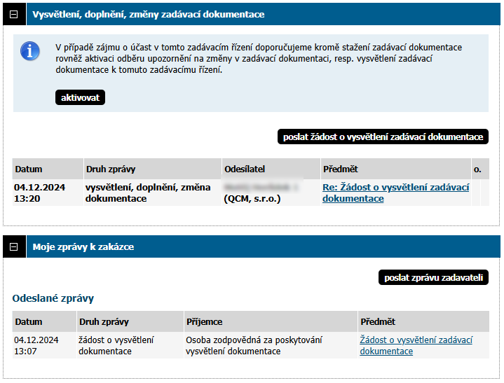Odeslaná žádost se dodavateli zobrazí v bloku Moje zprávy k zakázce.