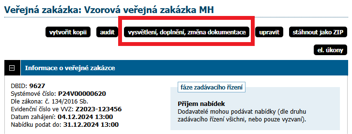 K uveřejnění z vlastního podnětu zadavatele slouží tlačítko vysvětlení, doplnění, změna dokumentace v detailu veřejné zakázky nahoře. Tímto způsobem lze řešit i situace, kdy žádosti o vysvětlení zadávací dokumentace jsou zasílány mimo systém E-ZAK, např.