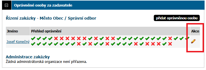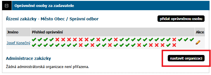 Je třeba si nastavit oprávnění Nastavit organizaci oprávněnou k administraci VZ, tedy kliknout na tužku ve sloupci Akce a zmíněné oprávnění v sekci Oprávněné osoby zatrhnout.