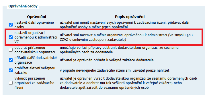 Zde zatrhněte druhé oprávnění s názvem Nastavit organizaci oprávněnou k administraci VZ.