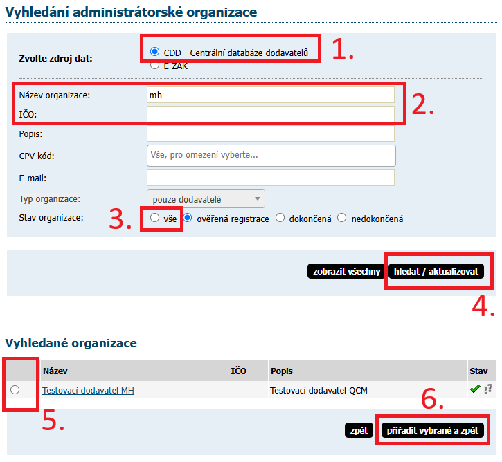 Prvním krokem je vybrání zdroje v katalogu organizací, tedy CDD. Dále můžete vyhledat administrátorskou organizaci podle IČO či podle jejího názvu.